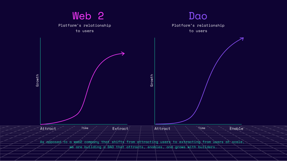 We aim to depart from the extractive networks that have been built in web2. The Facebook's, the Uber's, the Upwork's of the world all worked really hard to attract us in their early days, and then when they became inevitable via their network effects, they worked hard to trap us and to extract from us.